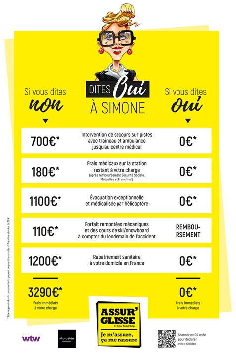 RAPPEL : les contrats d’assurance Assur’Glisse vous dispensent de l’avance des frais de recherche, secours et premiers transports médicalisés (barquette, ambulance, hélicoptère). Les frais de secours sur piste sont directement réglés à la Commune sur laquelle se trouve votre station, et les frais de transports médicalisés sont payés directement par l’assureur aux services de transport qui vous ont pris.e en charge.  Si un transporteur vous a réclamé le paiement d’une facture, ce n’est pas normal, signalez-le de toute urgence à la station et à WTW Montagne.
