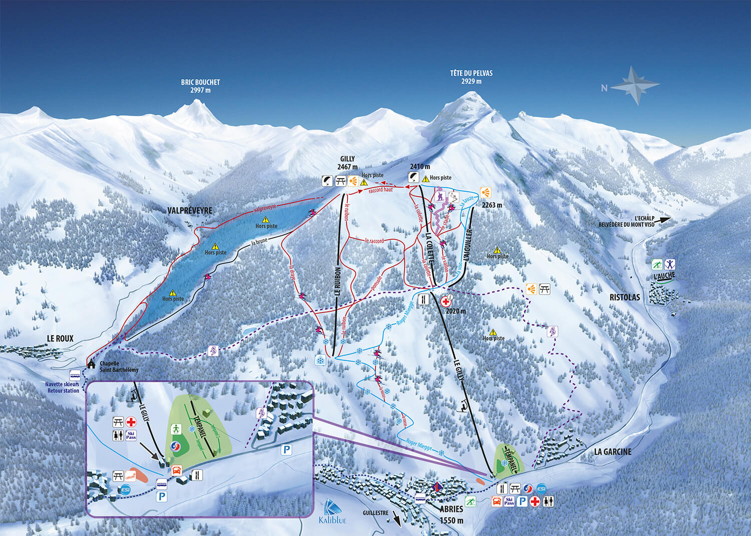 Côté glisse, sous la Tête du Pelvas (2929 m), le domaine skiable sauvage et nature d’Abriès offre 21 km de pistes et 900 mètres de dénivelé depuis le sommet du Gilly culminant à 2450 m d’altitude.